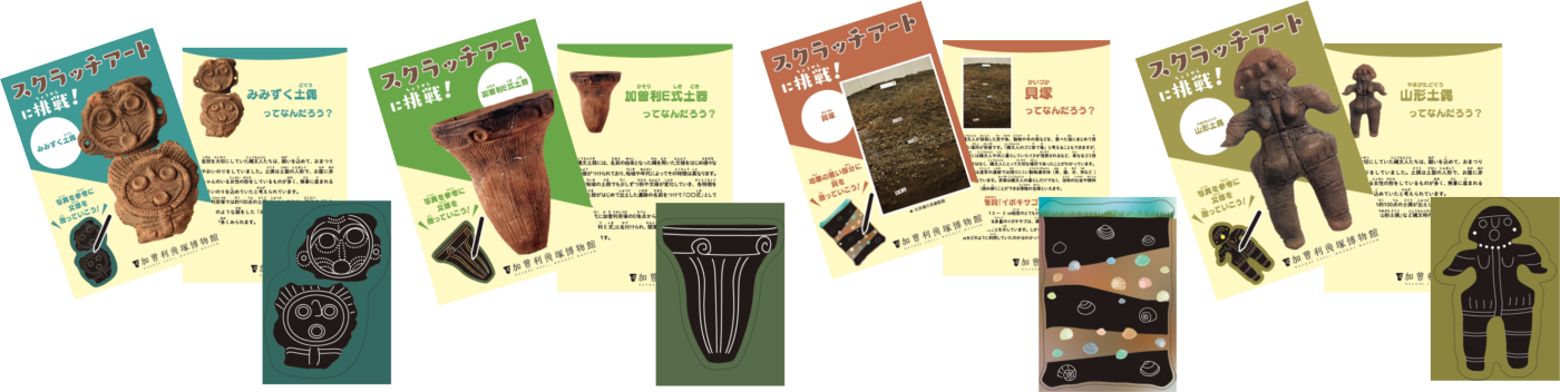 スクラッチアート 左から:みみずく土偶、加曽利E式土器、貝塚、山形土偶 |