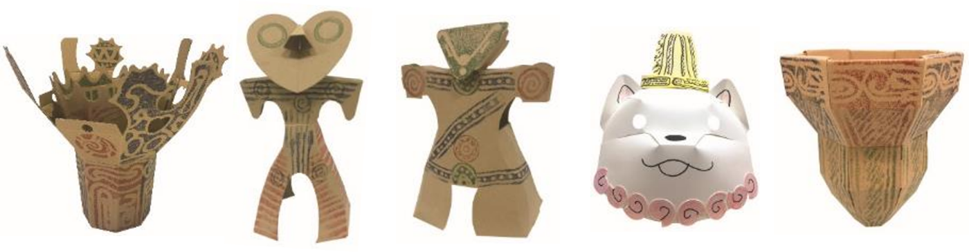 縄文土器をモチーフにしたペーパークラフトです。土器型に型抜きされた段ボールに、文様スタンプで装飾したあと、説明書を見ながら組み立てます。