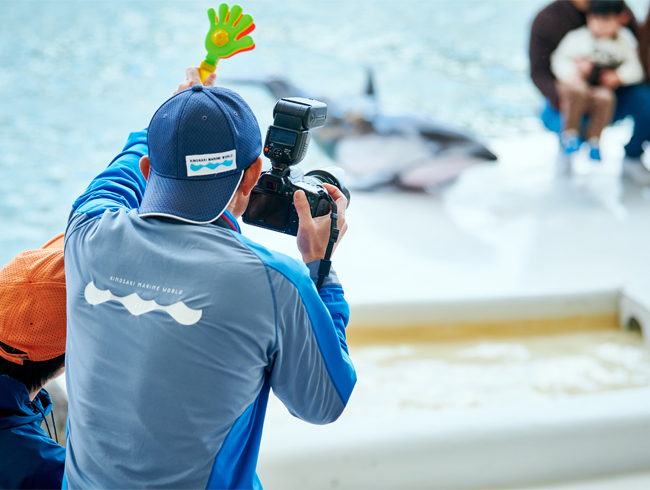 定番サービスとして展開している観光写真「どうぶつフォト」は、お客さまが見学の合間に気軽に写真撮影を依頼できるよう、撮影からお渡しまでの時間をなるべく短くすることが大切です。メインのイルカショーを例に挙げると、1回20分ほどのショーを平日4回、土日祝5回、繁忙期は7〜8回実施しており、「どうぶつフォト」はその合間の実質15分程の間に<撮影〜セレクト〜レタッチ〜印刷〜納品物のセット封入〜引換所保管〜次回撮影の募集>といった一連の流れを完了しなければいけません。