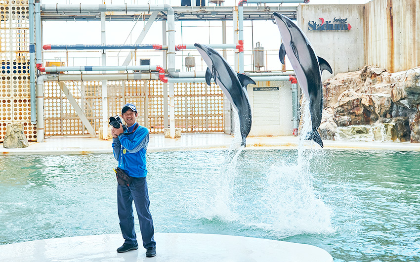 行楽地等でお客さまを専門のカメラマンが撮影し、その場でお渡しする観光写真。そこでしかできないコト体験を切り取り、思い出として持ち帰っていただける定番サービスですが、安定稼働の鍵を握るのは「撮影からお渡しまでの時間をいかに短縮するか」という点です。 城崎マリンワールドは、ユネスコ世界ジオパークに認定されている山陰海岸に面した、近畿エリアを代表する水族館施設のひとつです。イルカやペンギンと一緒に写真を撮れる「どうぶつフォト」サービスに、「DNP画像合成ソフトPD」を導入し、オペレーションを効率化しています。カメラマンが撮影した2L写真にオリジナル台紙と画像データをつけて販売する、付加価値の高いパッケージを実現しています。今回は、写真部のリーダーとして同サービスの運営に携わり、自らも撮影を担当されている森田さまに、導入の効果や可能性について伺いました。 (本記事は2023年11月に取材した内容をもとに構成しています。記事内のデータや組織名、役職などは取材時のものです。)