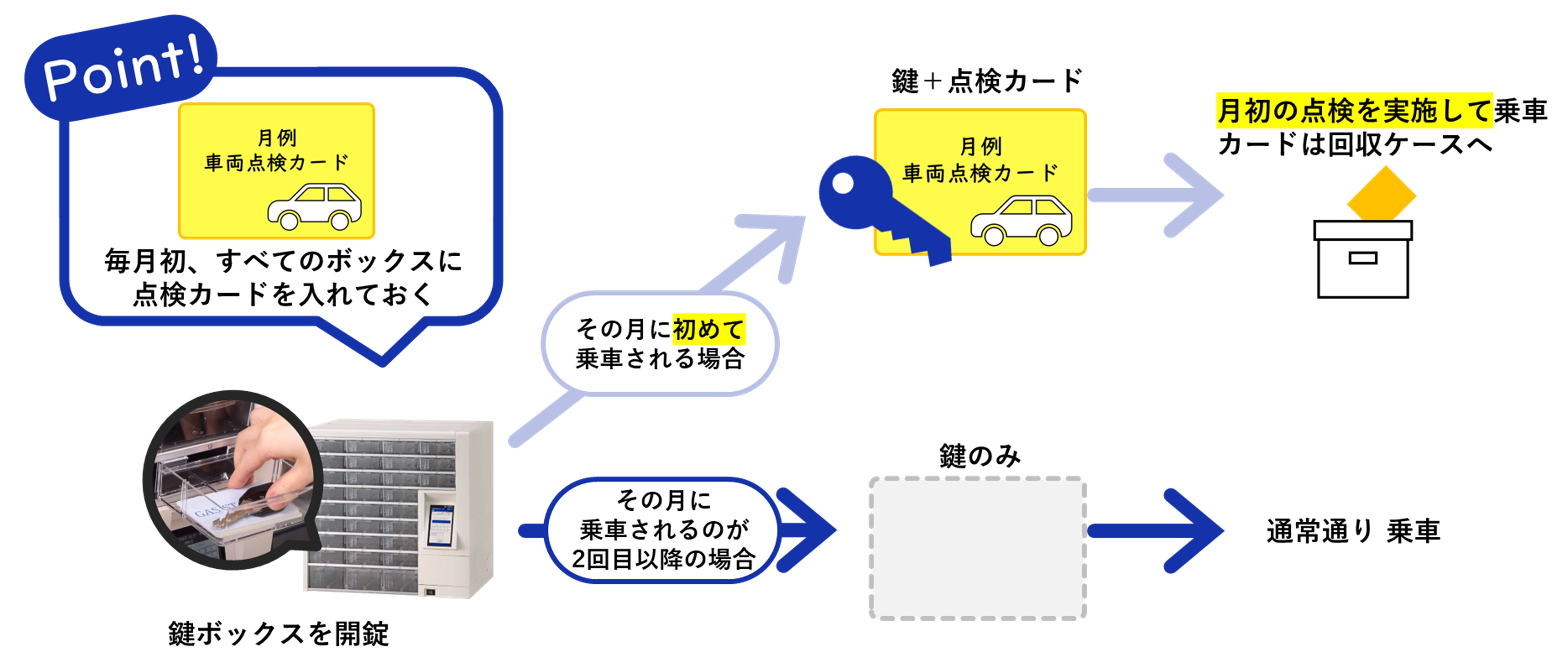 毎月初め、車両点検のフローとして各種点検(タイヤやブレーキの状態などを確認)する必要があります。これは車両ごとに実施しており、その月に初めて使用する車両へ行います。乗車予定の車両がその月に車両点検済みなのかをわかりやすくするために、毎月初めは点検の要否を判断するカードを鍵ボックス内に入れるようにしました。車両の鍵の取り出し時にカードが入っていた方は、車両点検を実施するというフローです。