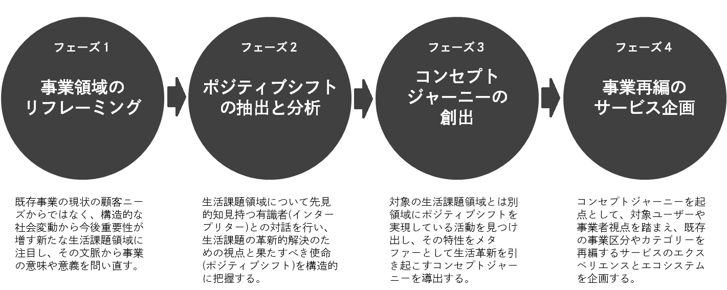 今回研究開発した手法は、既存事業の顧客ニーズからではなく、社会変動から今後重要性が増す新たな課題領域に注目して、生活者の価値観変化を構造化し、生活革新を引き起こす事業ビジョンを創出する手法です。
