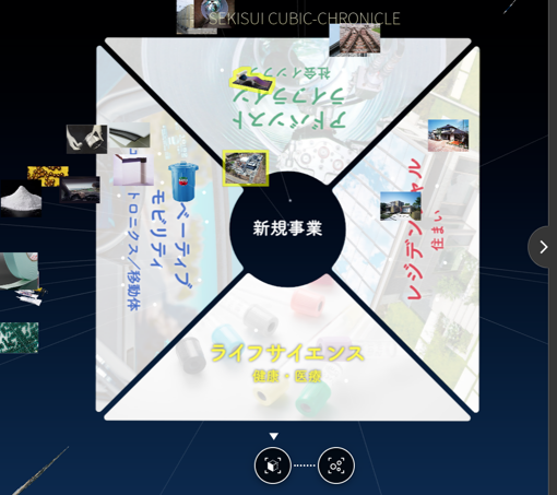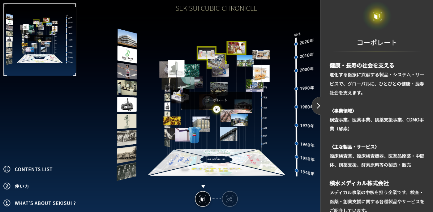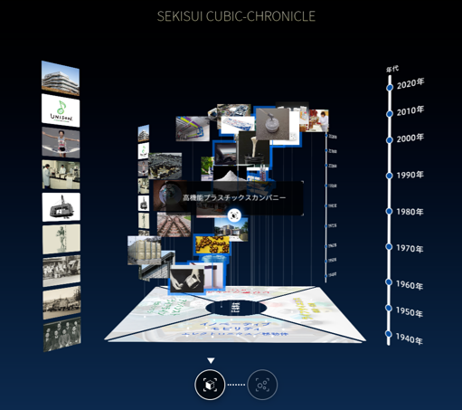 キューブ(立方体)の底面には積水化学グループの4つの事業領域を配置し、縦軸は創業から現在までの歴史年表を設定しています。各事業領域の製品が生まれた変遷を時系列に沿ってあらわすことで、「製品の属する事業領域」「製品同士の関係性」をわかりやすく知ることができます。キューブ側面には、3つのカンパニー(高機能プラスチックスカンパニー、環境・ライフラインカンパニー、住宅カンパニー)とコーポレートの計4つのテーマを設定しており、数多くある製品をテーマの切り口から閲覧することができます。