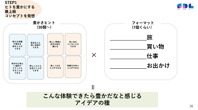 ①左側に生活者を豊かにするアイデアを「豊かさヒントカード」を使って発想