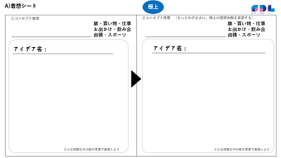 サービスデザイン・ラボのワークショップでは他人が考えたアイデアの「いいな」と思ったポイントに乗っかる形でさらに発展的なアイデアを共創していくというスタイルで実践しています。ただ、「このアイデアの良いポイントに乗っかっていく」という行為はワークショップに慣れていない参加者の方は意識しないと自然にはできないことも多いため、今回のワークショップではアイデア発想時の記入フォーマットを工夫し、参加者の中で自然な乗っかり合いが起こるように工夫しました。