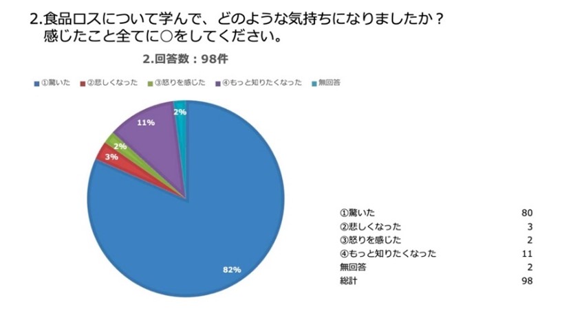 食品ロスの学びに関しては、現状に対して「驚いた」という回答がとても多くありました。食品ロスを数値的にわかりやすく伝えたことで、子どもたちの自分ゴトとなり、食品ロスの現状に対して素直な感想が見られました。