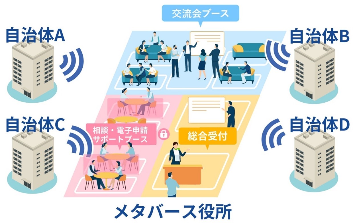 「メタバース役所」は、自治体の行政DXサービスとして、2024年7月に提供を開始し、複数自治体で1つのメタバース役所を利用する「共同利用モデル」と、1自治体に対して1つのメタバースで行政サービスを提供するカスタマイズ可能な「個別利用モデル」を揃えています。
