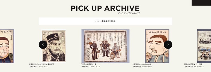 多様な利用者を想定し、使いやすさを重視したスタイリッシュなデザインとしました。サイト上部には所蔵資料の画像をタイル状にランダムに配置し、クリックすると資料の詳細画面へ遷移します。さらに、「PICK UP ARCHIVE」では、ウェブ上の展覧会のように、テーマに合わせた所蔵資料を紹介し、利用者の興味喚起を促します。