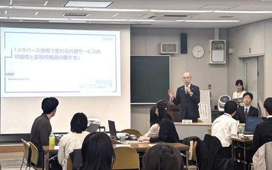 2024年11月、葛飾区役所にて、一般社団法人プラチナ構想ネットワークが主催する「プラチナ構想スクール@葛飾」が開催されました。このプラチナ構想スクール@葛飾は、自治体中堅職員を対象とした政策立案研修であり、各界の最前線で活躍する方々からの講義や現場での調査実習を通じて、地域の課題を解決する事業を立案することを目的としています。この研修の一環として、DNPのXR関連事業を担当するXRコミュニケーション事業開発ユニットのユニット長である浜崎が講演を行い、現在様々な自治体で活用されている「メタバース役所」サービスの体験会を実施しました。