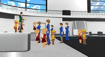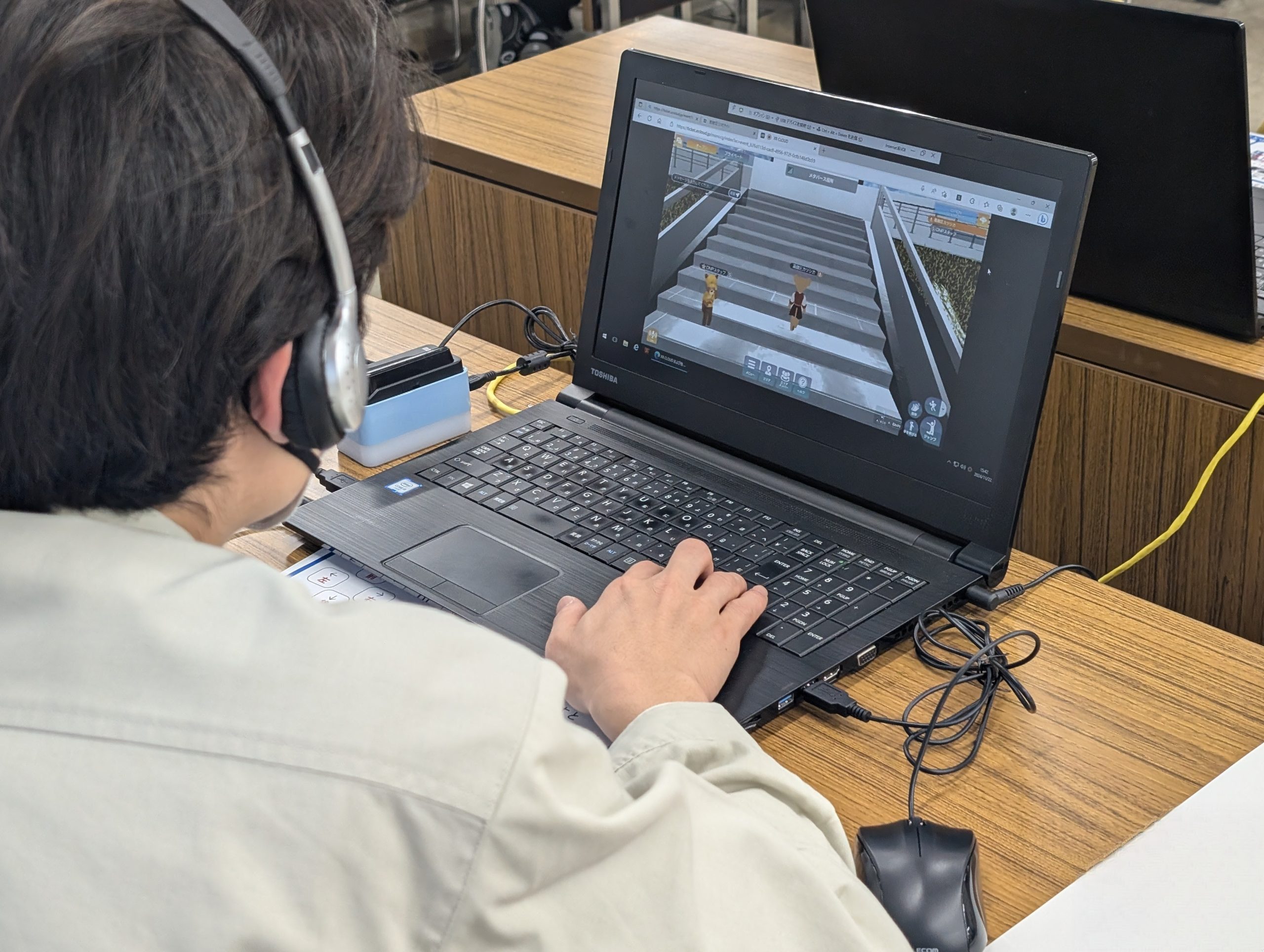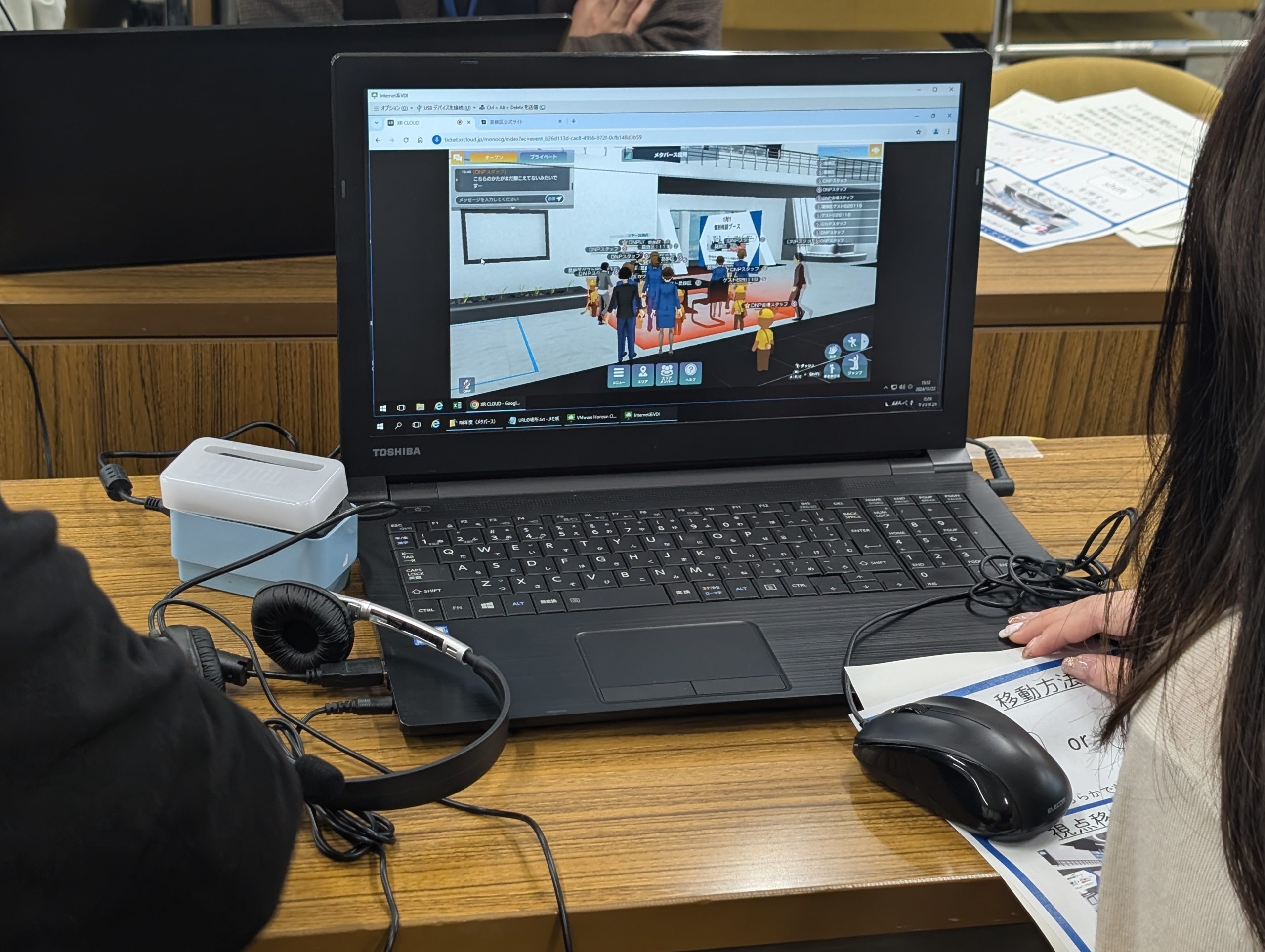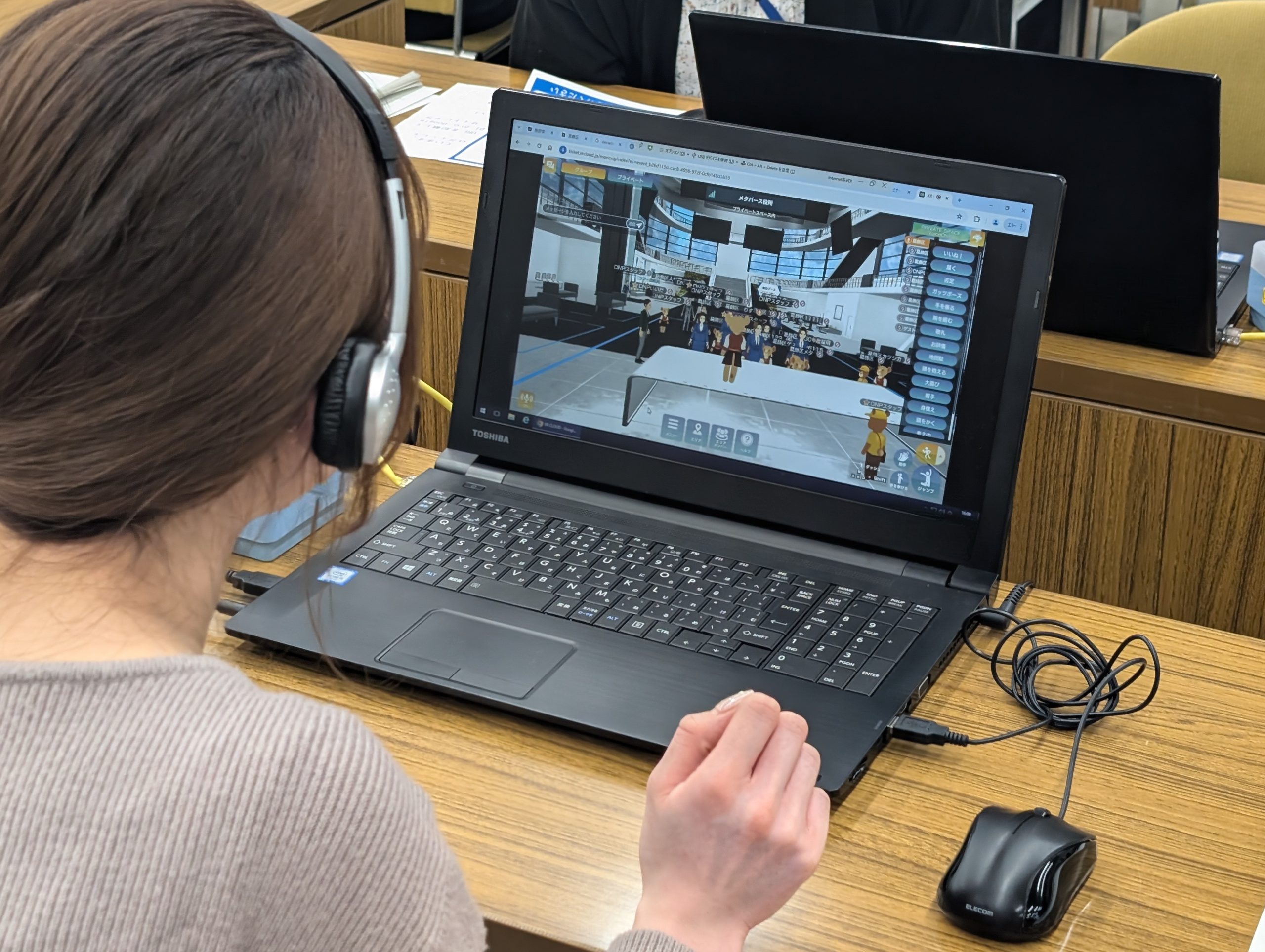 DNPの講演後、研修に参加した職員向けに、「メタバース役所」内でアバター操作など体験する体験会を実施しました。 「メタバース役所」のアバター操作はPCの矢印キーで行えます。職員はすぐに操作に慣れ、メタバース役所空間内を自由に移動したり、感情を表現するエモート機能をうまく活用していました。また、空間内でDNP社員が各種機能の説明を行った際も、エモート機能や音声出力(マイク)を通じて、積極的にコミュニケーションをとりながら楽しんでいる様子がみられました。
