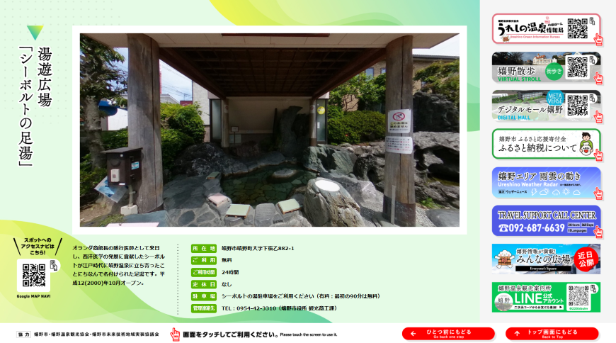 このタッチパネルサイネージでは、観光客の方が、旅ナカでの情報収集の場として、嬉野観光拠点の360度VR、バーチャル観光等を楽しみながら体験できるようになっています。