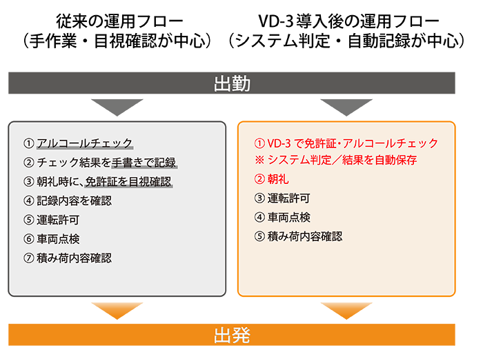 VD-3を導入したことで、一連の流れでアルコールチェックと免許証の携帯確認・有効期限チェックを同時に実施できるようになりました。目視確認を省く事業所も増えていることもあり、点呼作業が厳格化されただけでなく、一部の確認作業が不要となったと感じています。