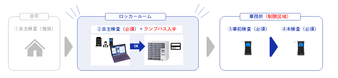 ロッカールームにVD-3と鍵ボックスを設置することで、出勤時打刻前の段階で「自主検査(必須)」としてアルコール検査を実施します。業務に就くため、そして事前検査や本検査を行うためには制限区域内の事務所へ向かう必要があり、そのためにはランプパスが必要です。ランプパスは鍵ボックスに収納されているため漏れなくアルコール検査を実施することとなり、数値が検出された者はランプパスを取り出せず物理的に先に進めないという仕組みです。自主検査の必須化による検査漏れを撲滅し、酒気帯び疑いのある者を上流(ロッカールーム)の段階で食い止め事前検査や本検査に進ませないことで、企業としてのコンプライアンス向上にも繋がります。