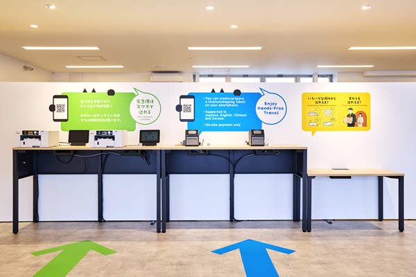 国内・海外の方が迷わずサービスを利用できるよう、ユニバーサルデザインを意識し、ピクトグラムと矢印を活用した床面グラフィックを設置。矢印をたどることでサービス案内がセルフで受けられる体験動線としました。