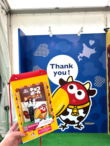 森永製菓さまのブースでは、巨大な「チョコボール」のパッケージの前で記念撮影ができるフォトスポットを設置。「DNP画像合成ソフトPD」による撮影システムを活用し、その場でプリントしてお渡しする体験を提供しました。さらに、撮影した写真はオリジナルの「チョコボールバッグ」の背面に飾ることもでき、来場者の手元に残る特別な記念品として展開されました。