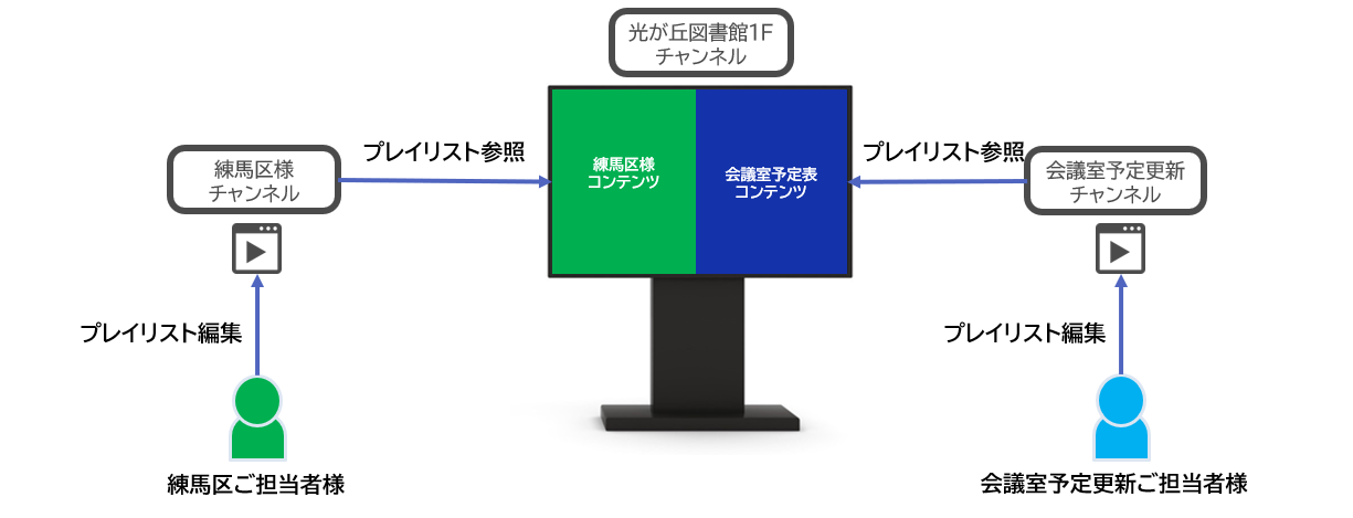 また、SmartSignageのプレイリスト参照機能・画面分割機能を用いて、左右の画面の更新権限を分けています。