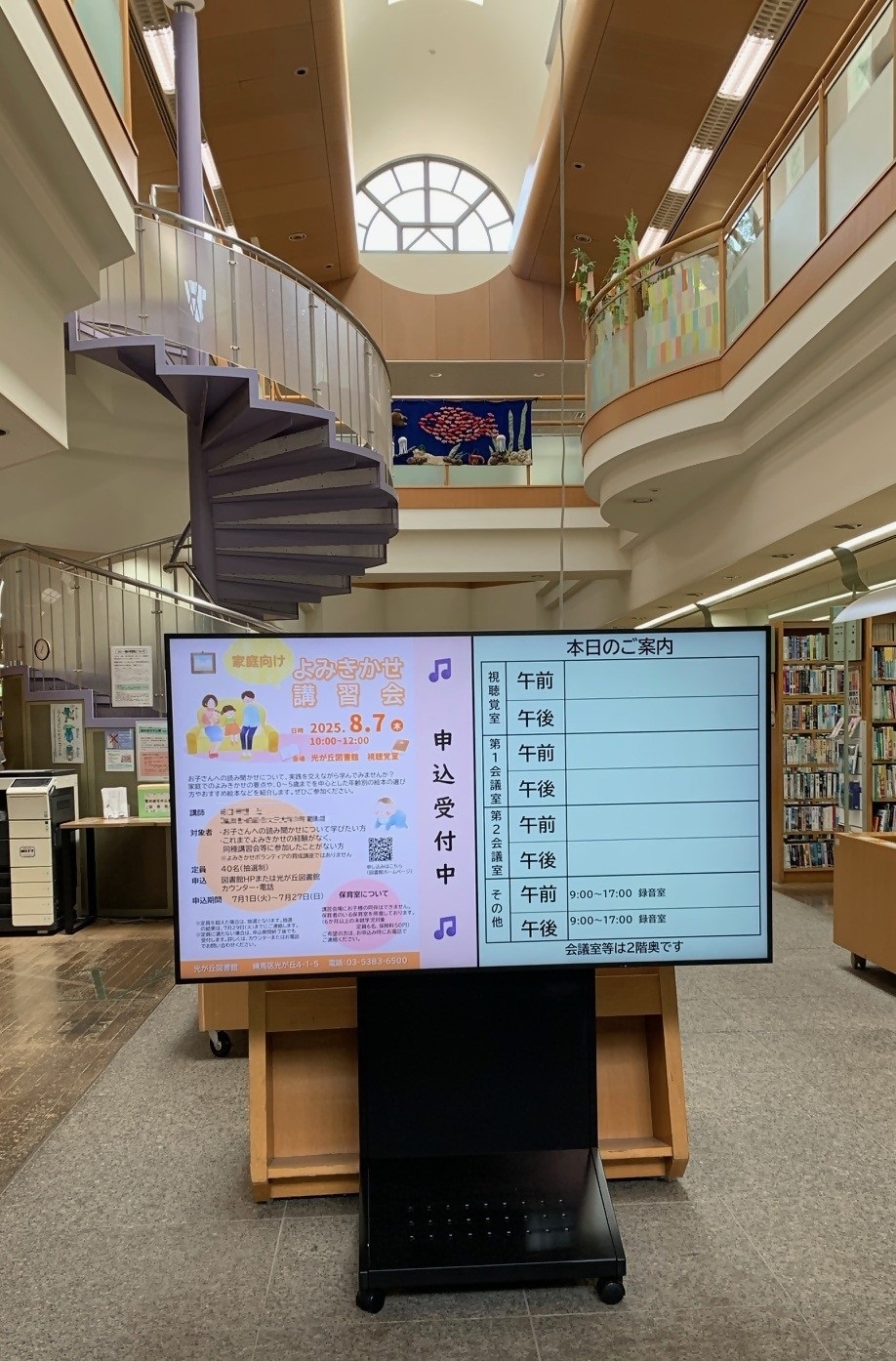 所蔵数約38万点の練馬区内最大の図書館である「光が丘図書館」(練馬区光が丘4-1-5)に、65インチのデジタルサイネージを導入していただきました。