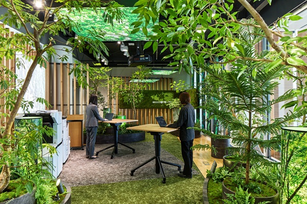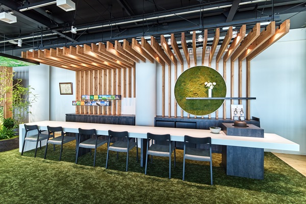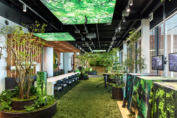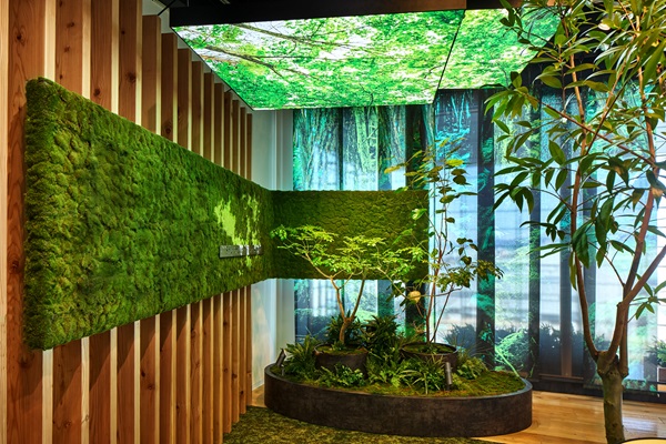 “信州・長野県の森”の表現にあたっては、長野県産材を用いた造作や家具を取り入れ、同社のプリント技術を生かし布材に出力を施した光幕天井や行灯照明から、木漏れ日や森の中に入り込んでいくようなデザインをちりばめました。また、シーンや時刻に合わせ朝昼夕と変化する照明、マスキング効果を兼ねた鳥のさえずりや川のせせらぎが広がる環境音から、ワークスペースとしても心地良い空間を実現しています。