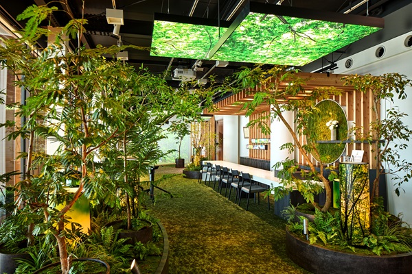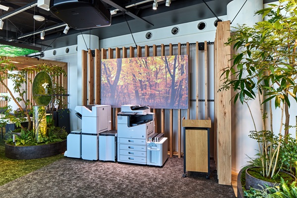 ビジネスインクジェットプリンターの提供価値と技術力を伝えるビジネス空間のリニューアルを支援しました。“地域や自然との共生”を礎としたモノづくりを通して、エプソンが未来へつないでいく、 “信州・長野県の森”を表現した空間において、実機によるデモを行うプレゼンテーションスペース、コミュニケーション活性化に寄与するおもてなしのカフェスペースをしつらえています。