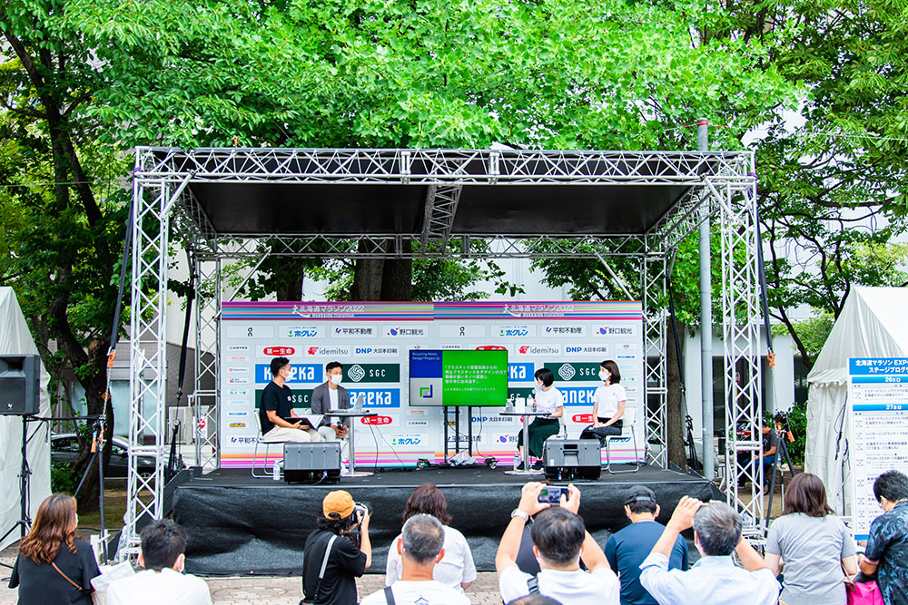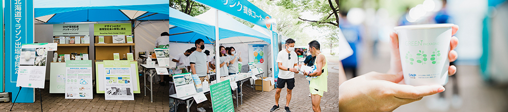 DNPは2017年からパートナー企業として、SDGsに取り組む北海道マラソンを応援してきました。3年ぶりの開催となった「北海道マラソン2022」では、大通公園にブースを出して、そこでRMDなどDNPが行っている環境への取り組みを紹介しました。