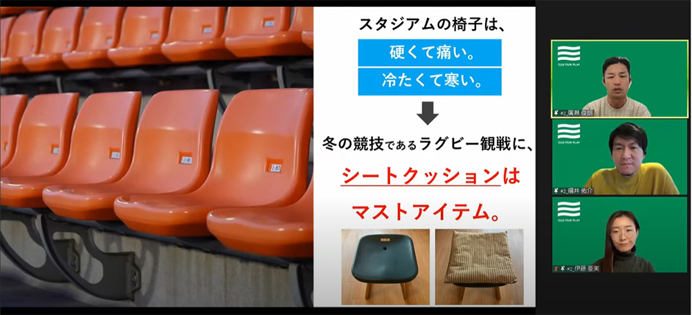 ラグビーは冬のスポーツ。観戦中は寒いので、スタンドではシートクッションを使います。このシートクッション、安く販売されていることもあって使い捨てにされ、試合後は大量のゴミになることがある、とスタジアムの方へのヒアリングで知り、それを何とかしたいなと考えました。