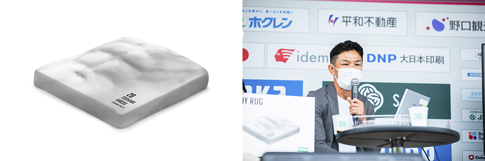 TEAM FAIR PLAYが考案した、立体的にプリントされた筋肉美が特徴の「BODY RUG(ボディラグ)」(写真左)。トークセッションでも「BODY RUG」を紹介(写真右)。 |
