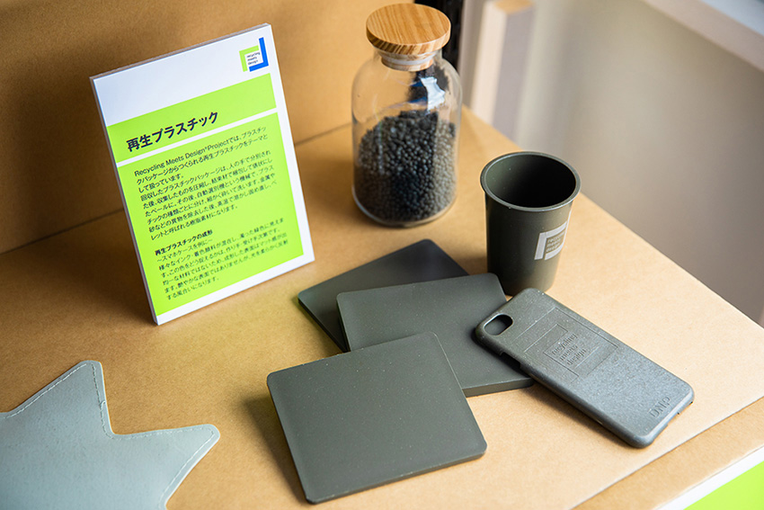 再生プラスチックを活用したカップやスマートフォンケース。深緑に近い色とザラザラした質感が特徴で、ロットによって変化する。RMDからは、その不安定さをあえて個性として活用するアイデアが多数生まれた。 |