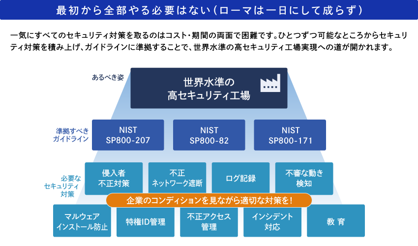 企業そして工場の現場にはそれぞれさまざまな事情があります。事業も違えばプロセスも異なりますし、予算や人手にはそれぞれ上限があり、優先すべき事業目標によってスケジュールも異なります。このため、全体を包括的に見て、できるところから一つずつ対策を積み上げていく段階的アプローチが現実的です。