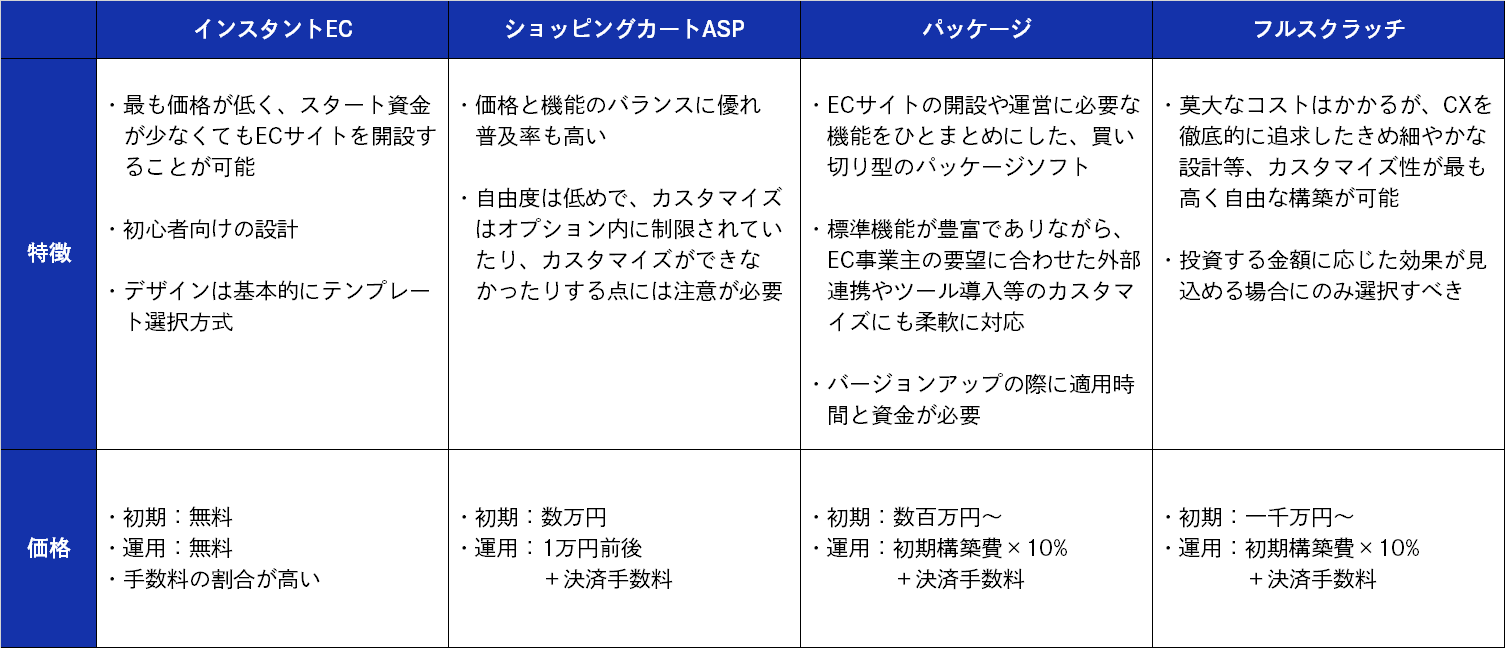 これまでに挙げたサービスとは異なり、ECサイトをゼロから開発することを指します。莫大なコストはかかりますが、カスタマイズ性が最も高く自由に構築ができる点は、他にはない大きなメリットといえます。CXを追求したきめ細やかな設計が可能ですが、投資する金額に応じた効果が見込める場合にのみ選択すべきでしょう。一般的に必要な費用には幅がありますが、初期費用は1000万円から、運用費用は初期費用の10%程度の費用が月額で発生し、さらに決済手数料が数%かかってきます。