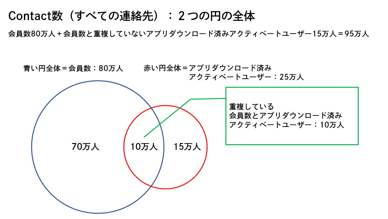 「会員の全数と会員になっていないアプリのみのユーザーが15万人になりますので、Contact数(すべての連絡先に入っている数)は合計で95万人となります。」