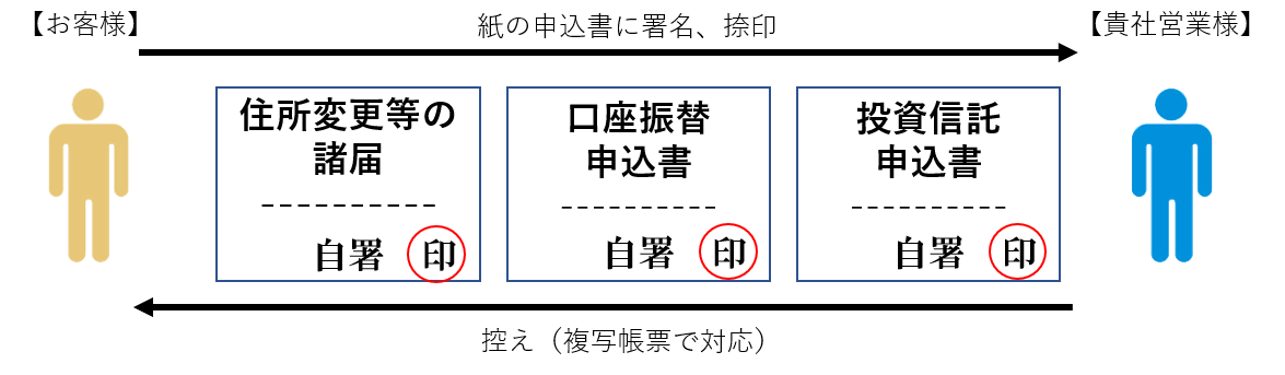 金融機関で扱っている申込書は、サービスや商品によっていろいろありますが、大抵の場合、生活者の自署が必要になっています。また、申込書によっては、生活者の捺印が不可欠なケースもあります。さらに、記入した申込書の控えをその場で渡す場合は、複写帳票を使って1枚を生活者に控えとして返却しています。