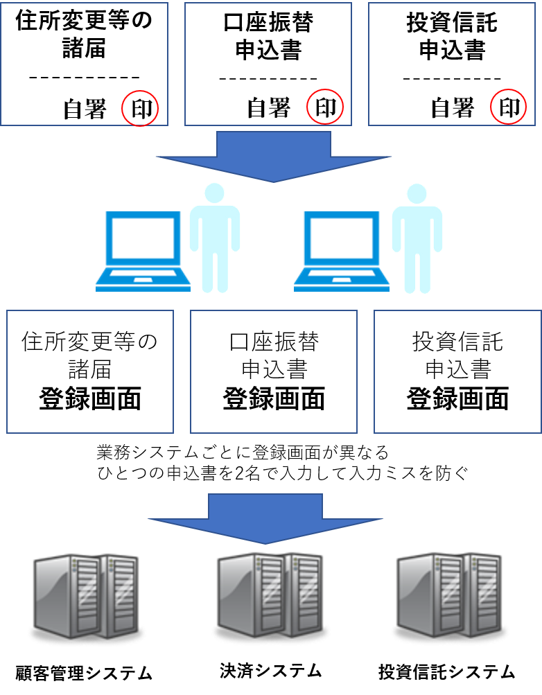 生活者とのやりとりは、一旦、これで終わりますが、実際にはこの後システムに登録する作業が残っています。申込書に記載された内容を、キーパンチ入力してシステムに取り込みます。業務ごとに帳票が異なる場合、入力するシステムもそれぞれ異なり、同じ帳票を複数人で入力し、内容をすり合わせることで、入力ミスを防ぐ工夫をしている場合もあります。
