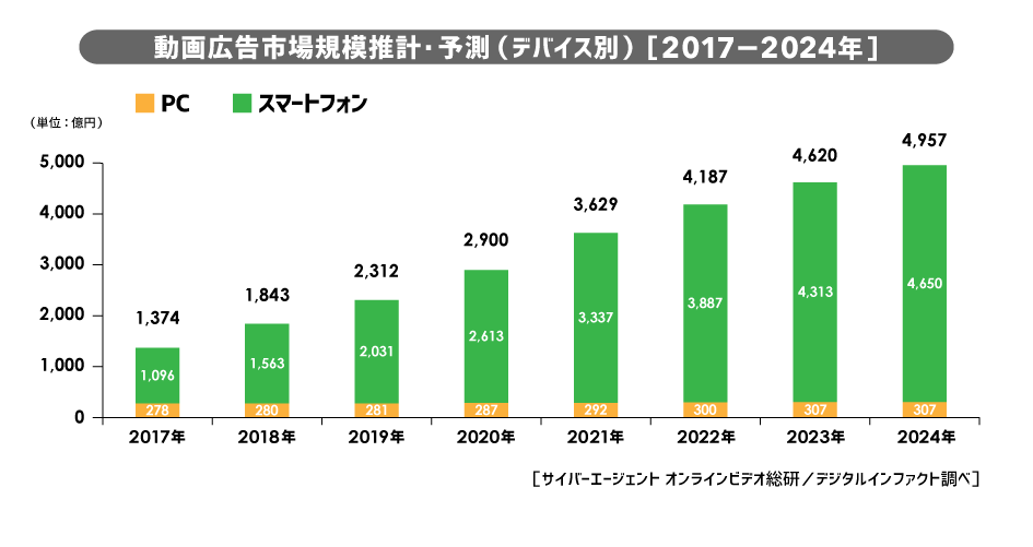 スマートフォンの性能改善・普及により、通勤・通学中などの空き時間に、手軽に動画を視聴できる環境になりました。それに伴い、動画マーケティングは急速に普及しています。サイバーエージェントが発表した調査によると、2018年の動画広告市場は、対前年比134%拡大し、2024年には4,957億円にまで到達する見込みです。