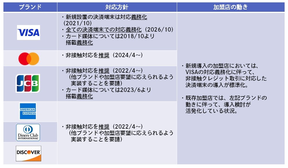 国際ブランドが展開しているクレジットカードのタッチ決済ですが、各ブランドで普及のための方針を打ち出しています。VISAでは新規発行のクレジットカードは全てタッチ決済としており、JCBも23年6月以降の新規発行カードはタッチ決済となり、他の国際ブランドも追随する動きをとる模様です。