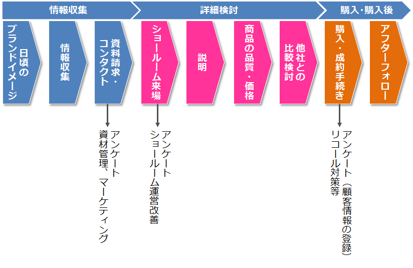 例えば、ショールームに来た顧客にショールームの内容だけではなく、ショールームに来るきっかけとなった情報源や自社Webサイトで参考になった情報などを聞くことにより、ショールームへ送客する際のポイントや改善点などの抽出が可能となります。