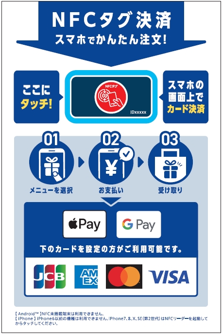 モバイルオーダー機能も含め、NFCタグ決済サービスは無料で提供しており、加盟店様は決済手数料のみで当サービスをご利用いただけます。