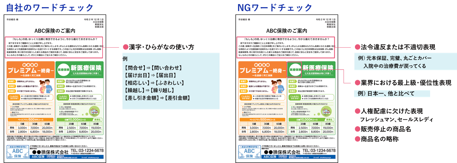 例えば、図の保険会社の広告販促物について、事前に学習したルールに反している表現がないかを確認し、正しくは「問い合わせ」と表記しなければならない箇所が「問合せ」と記されていることや、不適切な表現などが指摘されます。人はAIが指摘した箇所をチェックするだけで、校正・校閲業務を完了できます。