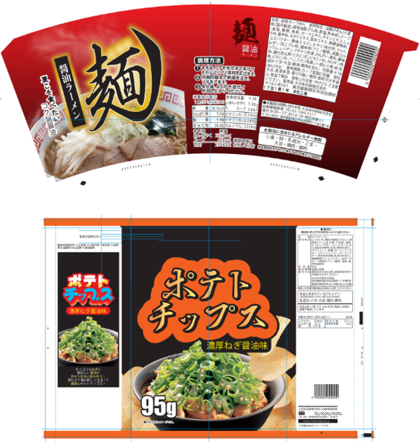 画像文字認識機能を実現するAI技術で、校正・校閲したい対象物のデザイン画像データからテキストを抽出します。この技術は、食品パッケージを起点にサービス開発されました。そのため、通常の文字に加え、図のような食品パッケージの「麺」「ポテトチップス」などのデザイン性の高い文字をテキストデータとして抽出することも可能です。画像化された文字を認識することができるため、パッケージ画像の最終確認にも活用できます。