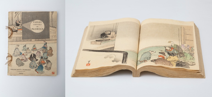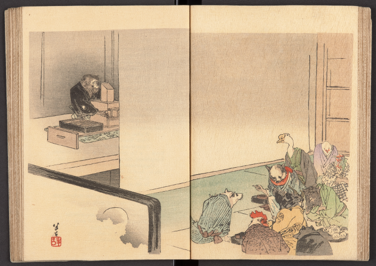 ちりめん本とは、明治中期から昭和初期にかけて出版された、挿絵入りの小型の和綴じ本です。細かいしわを寄せたちりめん状の和紙を使用しているため、「ちりめん本」と呼ばれています。日本の昔話などを外国語に訳した本で、訪日観光客向けのお土産として人気がありました。ちなみに、印刷所欄にある「秀英舎」とは、DNPの前身会社です。