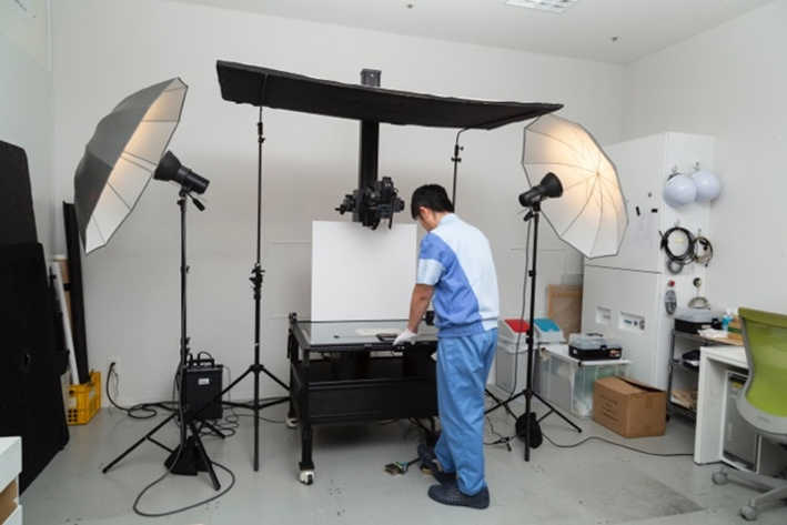 対象物の色味や風合いを正確にスキャンすることを前提とし、ライティング(照明)やカメラの位置を細かくセッティングします。お客さまのオーダーに合わせて色味の表現を工夫したり、質感のある素材では立体感が出るようにしたりといった調整も可能です。