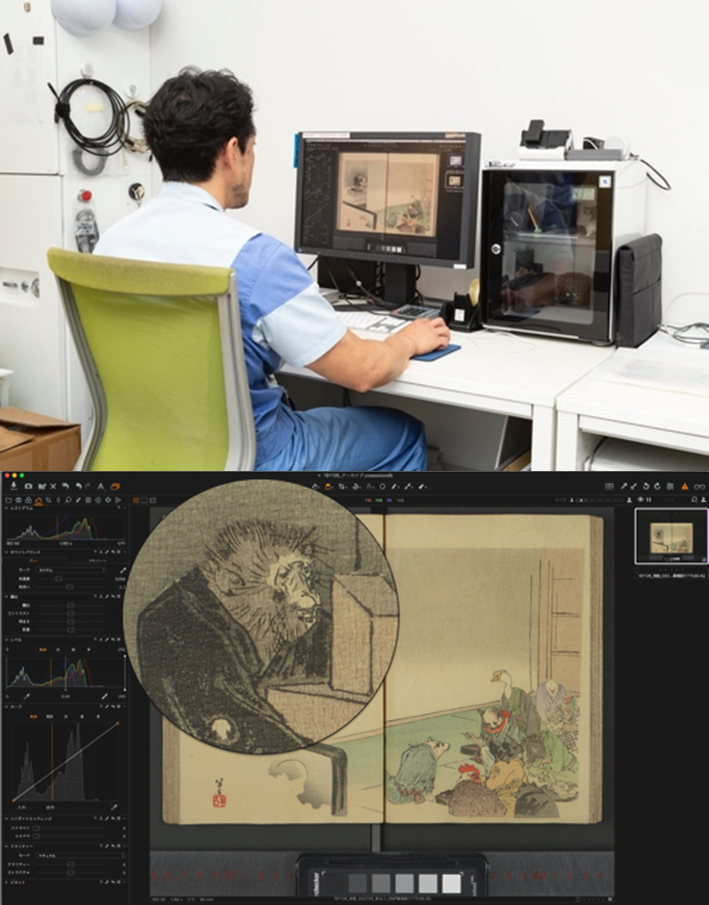スキャン台の隣に設置されたパソコンで撮影データを現像処理*し、原本となるマスターデータを作成します。1回撮影する度に、現像処理によってパソコン上でデータを確認できるようにし、細かいほこりが入り込んでいないか、細部にまでピントが合っているかなどを見ていきます。