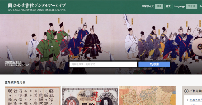 国立公文書館で収蔵している公文書や重要文化財がデジタルアーカイブ化されています。古い公文書が見られることはもちろんですが、オンラインビューアの使い勝手が良いところがポイントです。