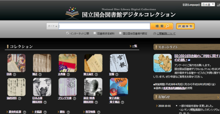国立国会図書館で収集、保存している図書約90万点などがデジタルアーカイブ化されており、著作権が切れているデジタル資料はオンラインデータベースで検索閲覧できます。