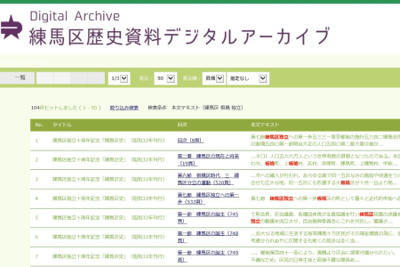 平成29年の練馬区独立70周年を記念して、「練馬区史」の一部をフルテキスト化、練馬区の歴史資料をデジタルアーカイブ化し、オンライン上で閲覧・検索を可能としました。