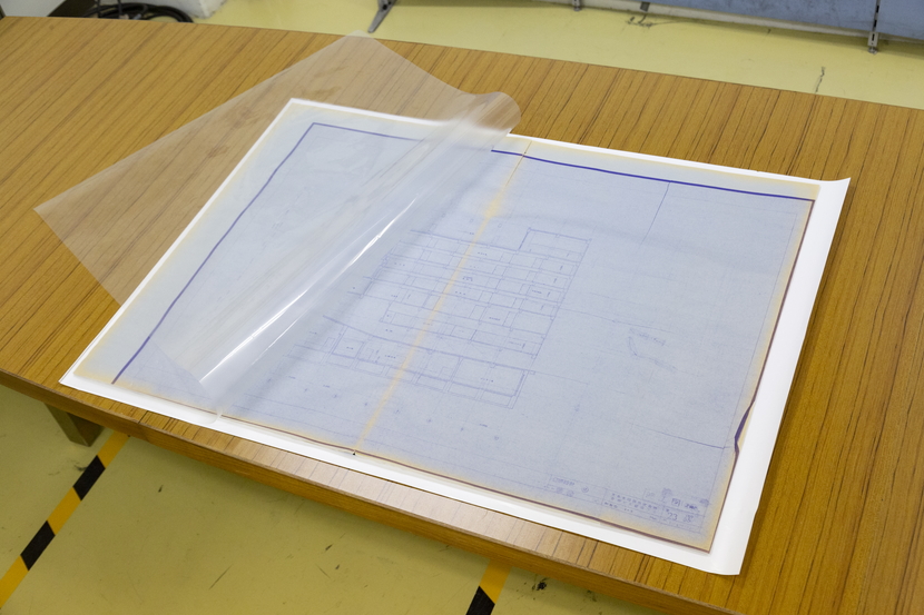ページによって厚みが違うと精度の高いスキャンができないため、対象物によっては、紙を挟むなどして高さを揃える作業があります。また、光源が動くのではなく、図面の方を動かしながらスキャンするため、貴重な古い資料の場合は紙を傷めないようフィルムに挟む場合もあります。