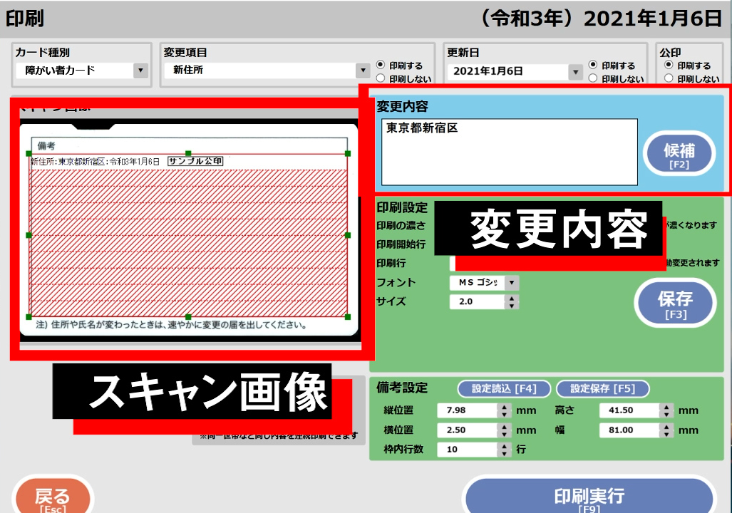 DNP券面プリントシステムの画面上で、印字位置、範囲の確認が可能です。また、障害者手帳交付台帳システムとDNP券面プリントシステムを同じPCにインストールし、同時に2つのシステムを起動すると、障害者手帳交付台帳システムの記載事項変更の記録の文字をコピーして、DNP券面プリントシステムの「変更内容」(右上のテキスト入力エリア)欄にペースト(貼り付け)することができ、打ち間違いのリスクが軽減されます。