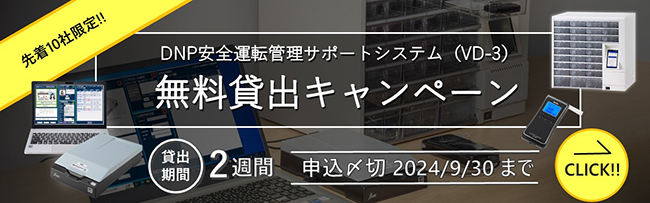 2023年12月1日より、白ナンバー事業者のアルコール検知器を用いたアルコールチェックの義務化が施行されました。アルコールチェックを厳正化・効率化したいお客様へ、DNP安全運転管理サポートシステム(VD-3)(以下、VD-3)が運用に合っているかをお試しできる貸出キャンペーンをご用意しました。貸出数には限りがございますので、ご興味のある方はお早めにお問合わせフォームよりお問合わせください。