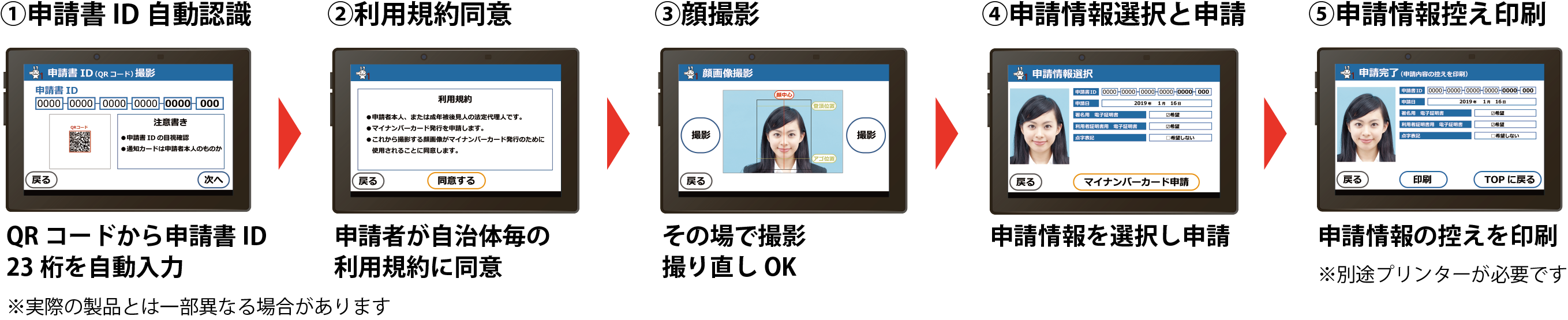 マイナンバーカードのオンライン申請に特化し、個人番号カード交付申請書ID(QRコード)の読み取りから、顔写真の撮影、申請内容の確認、オンライン申請までワンストップでサポートします。シンプルな操作画面で誰でも申請補助が可能で、申請完了まで5ステップのみとなります。