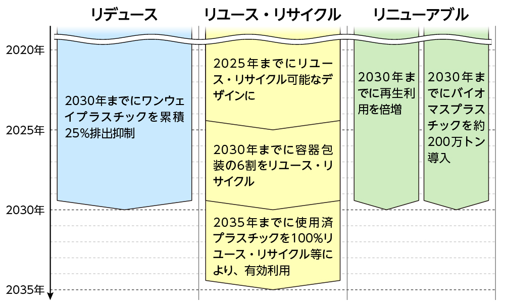 日本においても、2019年に政府が策定した「プラスチック資源循環戦略」で、基本原則となる「3R+Renewable」(※)やマイルストーンが定められるなど、官民一体となって解決に取り組む動きが加速しています。