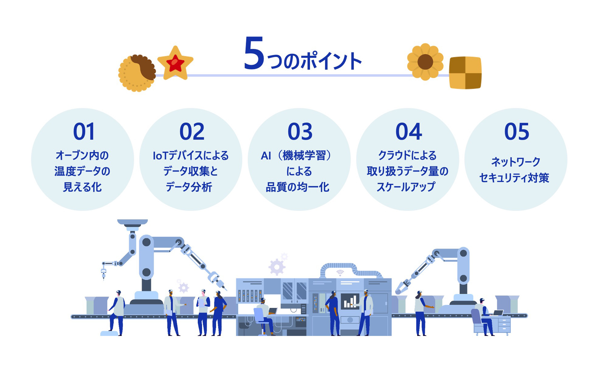 従来の生産ラインでは、同一の製品を2つのラインで生産した場合に、品質が一定にならないという問題がありました。この問題を解決するために、品質の高い生産ラインの表面温度・気温・湿度・気圧・ベルトコンベアーの速度といったデータを取得。AI(機械学習)で分析して生産条件を算出し、オーブン内で最適な焼き上げが行われるように設定テストを重ね、品質を均一にしました。